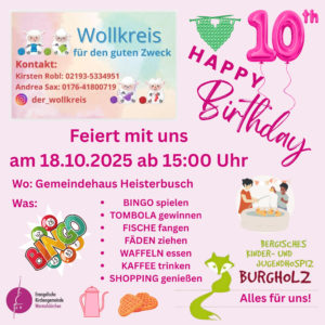 Und wie das bei einem Geburtstag so ist, wird es ein buntes Programm geben! Geplant ist BINGO-Spiel für Groß und Klein, TOMBOLA, Angelspiel, Fadenziehspiel, frische Waffeln mit Kaffee und natürlich Gelegenheit zum Shopping an unserem Wollietisch (Weihnachten kommt auch dieses Jahr ganz sicher, noch können Bestellungen angenommen werden). Wir bleiben dem 1,00€-Beitrag treu; egal ob BINGO-Karte, TOMBOLA-Los, Waffel, Kaffeepott oder Spielstation – mit je einem Euro ist man dabei! Wie immer gilt: der gesamte Erlös ist zugunsten des Kinderhospiz Burgholz!