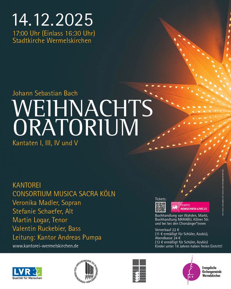 Großes Weihnachtskonzert 2025 der KANTOREI und Gastsänger*innen, Barockorchester CONSORTIUM MUSICA SACRA KÖLN, den Solisten Veronika Madler (Sopran), Stefanie Schaefer (Alt), Martin Logar (Tenor), Valentin Ruckebier (Bass), Gesamtleitung: Kantor Andreas Pumpa